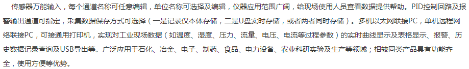 簡介:可實現對工業現場數據(如溫度、濕度、壓力、流量、電壓、電流等過程參數)的實時曲線顯示及表格顯示、報警、歷史數據記錄查詢及USB導出等。廣泛應用于石化、冶金、電子、制藥、食品、電力設備、農業科研實驗及生產等領域;相較同類產品具有功能齊全,使用方便等優勢。